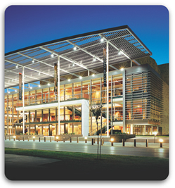 To reduce the effect of the sun's heat and glare at the magnificent University of California Davis Performing Arts Center, BOORA Architects specified a C/S Horizontal Sunshade featuring 17'' airfoil blades. The blades are supported by cut aluminum brackets mounted to rectangular vertical tubes that are independent of the curtain wall. Blades are mounted 18'' O.C.